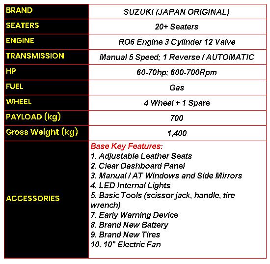 Designed to meet the demands of public transport operations, the Suzuki Full Body PUJ delivers reliability, passenger comfort, and fuel efficiency in one dependable vehicle. Powered by a trusted Suzuki engine and enclosed in a durable full-body build, it’s made for long hours on the road and consistent daily income.